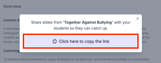 ⚠️ Note: This is only available for lessons that have been started or delivered, and cannot be generated beforehand. Students using this link won't be able to answer questions or interact with the lesson.
