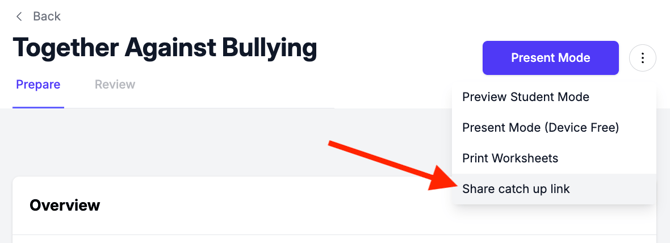 A catch-up link lets teachers send students a view-only version of a lesson that’s already been delivered. It’s designed to help absent students review lesson content independently.