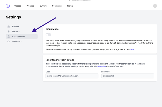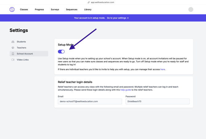 Enabling Setup Mode will temporarily halt the sending of account invitations. This allows you to safely add accounts, classes, and sequences without the risk of your staff and students accessing the platform prematurely.